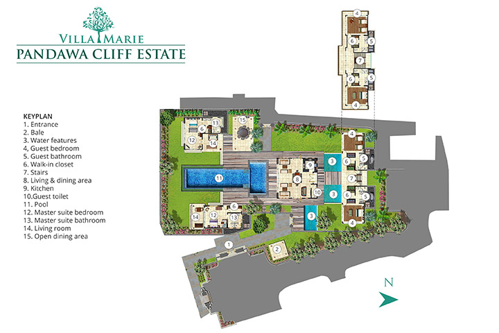 Indoor and poolside lounge; dining room with table for 14; table for 10; outdoor dining for 10; playroom; TV lounge; private sitting areas in bedroom suites.