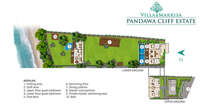 2 air-conditioned interconnecting living rooms; 2 air-conditioned interconnecting dining rooms with tables for 4; air-conditioned living/dining room in master suite; living pavilion with dining for 8; cliff-edge pavilion; lawn-edge deck with seating; 3 poolside decks with sun loungers and tables for 4.